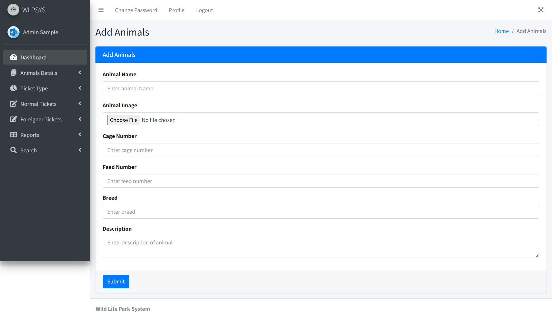 “Wildlife Park System” is a web-based technology which manage and automate key operations in a wildlife park. This web application simplifies ticket booking, animal record management, and administrative functions while ensuring a seamless experience for park administrators and visitors.